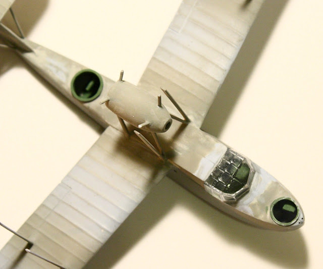 08/02/2012, El Walrrus MkI va tomando forma de a poco, ya monte las alas al fuselaje, pinte el motor y los pilotos ya casi los finalizo. La unión del fuselaje con las alas presenta grandes desniveles que no se solucionan de otro modo que aplicando masilla y lija, más de la misma historia. Aprovechando un resto de pintura base en el aerógrafo, le di una mano a las uniones y partes donde mayores cantidades de masilla apliqué. Obviamente que encontré algunos detalles que tendré que corregir. A continuación presento unas fotos de los avances.